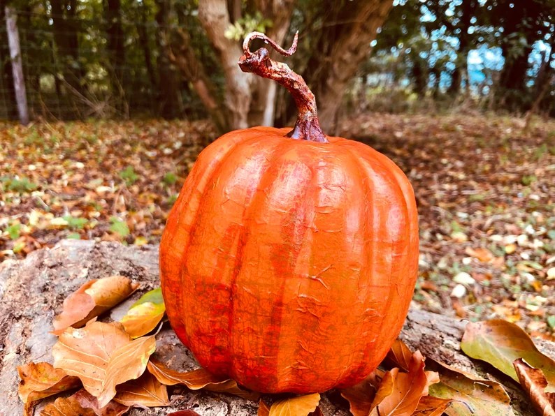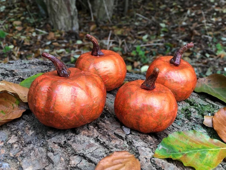 Four matching pumpkin decorations.
