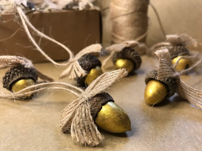 Hanging golden acorn decorations. Hand painted, with hessian cord and bows.